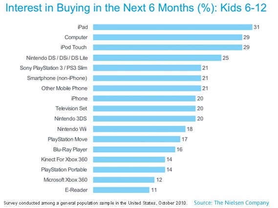 미국의 시장조사 전문업체 닐슨이 지난 10월 조사한 결과에 따르면, 6세에서 12세 사이의 아이들 중 31%가 아이패드를 `향후 6개월 내 선물받고 싶어하는 것` 으로 꼽았다. 그 외에 개인용 컴퓨터와 아이팟 터치가 29%, NDS는 25%의 아이들이 가지고 싶어 하는 것으로 조사되었다. 소니의 PS3는 21%의 아이들이 가지고 싶어했으며, MS Xbox360의 12%를 앞질렀다. 한편 교육용으로 효과가 있는 것으로 알려진 e북 리더를 갖고 싶어하는 아이들은 11%로, 17종의 제품 중 최하위의 관심도를 보였다.