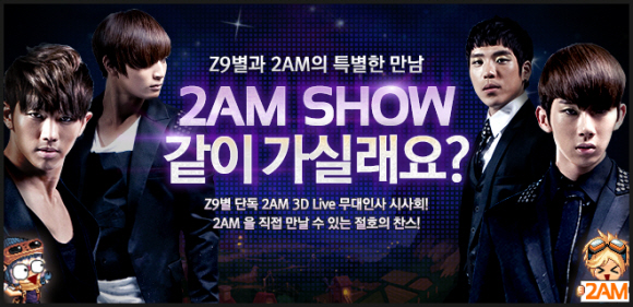 한게임은 인기가수 2AM과 공동으로 캐주얼 게임 `내맘대로 Z9별(이하 지구별)` 의 유저들을 초청하여 2AM이 출연한 3D 콘서트 영화 `2AM SHOW` 를 관람하는 단독 시사회를 오는 12월 중에 개최하고, 게임에서 특별 아이템을 획득한 게이머들에게는 2AM의 신규앨범을 증정하는 이벤트를 실시한다.