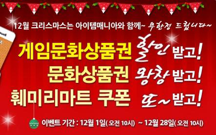 우선 상품권몰에 ‘게임문화상품권’을 도입한 기념으로 12월 한 달 동안 구매자에게 무조건 해당 상품권을 5% 할인된 가격으로 제공한다. 게임문화상품권은 ㈜한국문화진흥에서 발행하는 온라인게임을 위한 무기명 선불결제 수단으로, 넥슨/넷마블/엠게임 등 다양한 게임포털 외 총 230여 개 가맹점에서 사용 가능하다. 5천원 권, 1만원 권, 2만원 권, 3만원 권, 5만원 권의 5가지 종류가 있으며 아이템매니아 마일리지로 구매 가능하다.