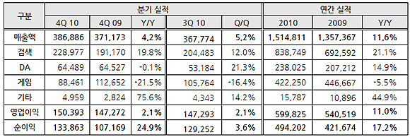 NHN는 2010년 연간 매출액 1조 5,148억원, 영업이익 5,998억원, 순이익 4,942억원의 실적을 달성했다고 밝혔다.