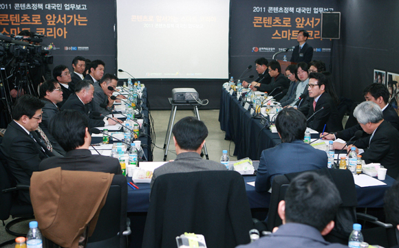 문화체육관광부(장관 정병국)는 지난 10일 서울 구로에 위치한 동우 애니메이션에서 ‘2011 콘텐츠 정책 대국민 업무 보고’를 갖고 콘텐츠산업 환경 변화와 정책 대응 및 제도 개선에 대한 토론회를 진행했다.