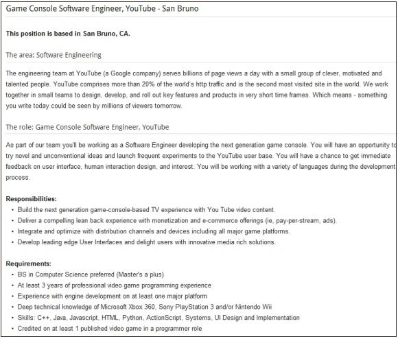 유튜브는 구글 구인 사이트를 통해 게임 콘솔 소프트웨어 엔지니어를 구한다고 공고했다. 주 업무는 콘솔 기기에서 유튜브의 비디오 콘텐츠가 포함된 차세대 TV 경험을 즐길 수 있도록 만드는 것이며, PS3/Xbox360/Wii 플랫폼에서의 깊은 개발 지식을 필요로 한다.