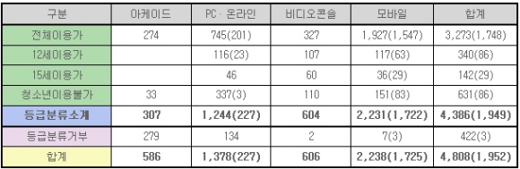 게임물등급위원회가 발표한 2010년 게임분류 통계