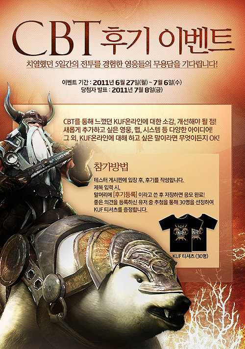 한편, ‘킹덤언더파이어 온라인’ 은 CBT 이후 유저들의 다양한 의견 수렴을 위한 이벤트를 금일부터 7월6일까지 진행한다. 참여방법은 게시판에 [후기등록]이라고 적은 후 게임에 대한 간단한 느낌이나 개선을 바라는 점을 올려서 응모할 수 있으며, 추첨을 통해 30명에게 KUF티셔츠를 제공한다. 당첨자는 7월 8일에 발표될 예정이다.