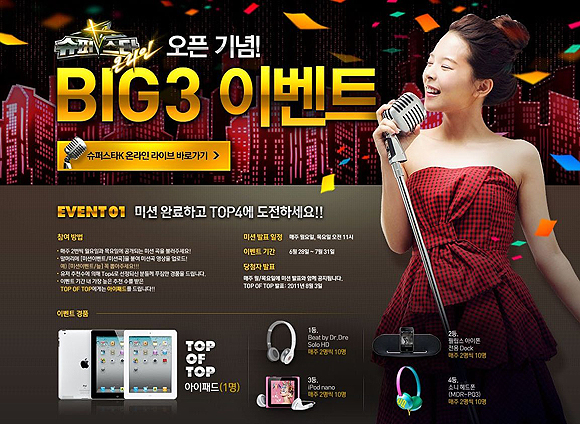 한편, `슈퍼스타K 온라인`을 통해 오는 8월부터 돌입할 ‘슈퍼스타K 시즌 3’의 슈퍼위크에 도전할 수 있는 ‘온라인 특별예선’이 준비되어 있다.