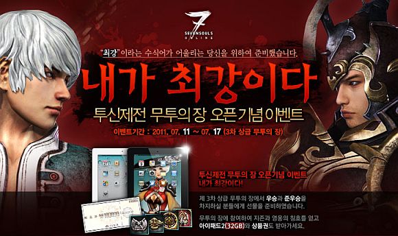 7월 11일부터 7월 17일까지 실시되는 이번 ‘내가 최강이다’ 이벤트는 3차 상급 무투의 장 우승자에게 지존의 칭호와 아이패드2, 백화점 상품권 그리고 아이템을, 준우승자에게는 영웅 칭호와 아이템을 증정한다.