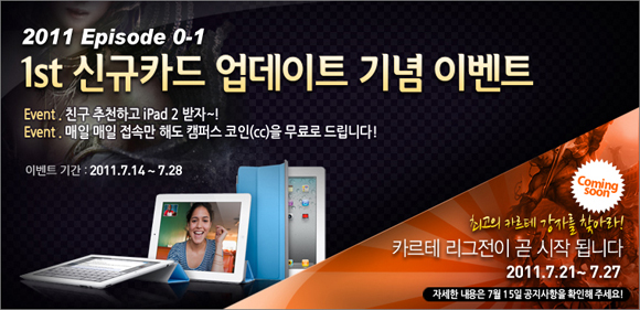 `카르테` 첫 업데이트를 맞아 풍성한 이벤트가 2주간 열린다. 친구 추천 이벤트와 캠퍼스코인 이벤트를 통해 각각 아이패드2를 추첨으로 증정한다. 또한 카르테 홈페이지에 로그인을 할 때마다 매일 캠퍼스코인을 지급할 예정이다. 카르테 대전 3판 이상 하거나 싱글모드 대전에서 승리할 때에도 캠퍼스코인, LC 쿠폰 등 푸짐한 상품이 주어진다.