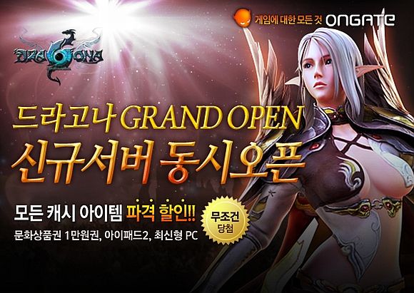 한편, 온게이트는 오늘부터 8월 21일까지 한달 간 드라고나 온라인 채널링 서비스 오픈 기념 이벤트를 진행한다. 이 이벤트는 이용동의, 캐릭터 생성, 레벨 달성시마다 응모할 수 있으며, 컴퓨터, 아이패드2, 문화상품권, 온게이트 캐시(토큰) 등 다양한 경품이 준비되어 있다. 이벤트와 관련된 상세한 내용은 온게이트 홈페이지 www.ongate.com에서 확인할 수 있다