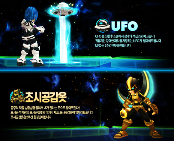 이번에 추가된 2종의 장비는 공중에 떠오른 상대를 붙잡아 원하는 곳으로 던짐으로써 피해를 입힐 수 있는 `초시공 갑옷’과 적진을 파고 들어 강력한 공격을 퍼붓는 `U.F.O` 로, 이 두 장비 모두 앞으로 2주간에 한해서만 판매되는 그야말로 레어 장비이다