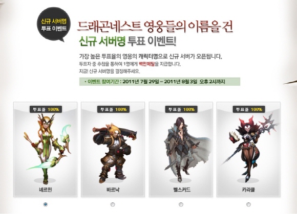 이번 이벤트는 오는 8월 4일 공개될 대규모 여름 업데이트에서 처음 열리는 신규 서버의 이름을 유저들이 직접 투표를 거쳐 결정하는 이벤트로, 투표 페이지에서 드래곤네스트 대표 영웅들의 이름 중 자신이 원하는 이름에 투표하면 최종 선별을 통해 서버 명이 결정된다. 이벤트에 참여한 유저에게는 추첨을 통해 게임에서 사용 가능한 백만 패탈(게임머니)이 경품으로 제공된다.