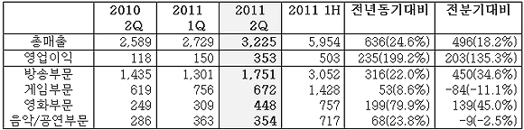 CJ E&M은 2011년 2분기에 매출 3,225억원, 영업이익 353억원의 경영실적을 올렸다고 11일 공시했다.