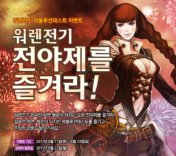 이와 함께 테스트 참여자 전원에게는 OBT때 사용 가능한 ‘성장의 비약’과 ‘확장가방’ 아이템을 제공하며, 테스트 기간 동안 ‘레벨을 달성하라’, ‘길드를 창설하라’, ‘워렌전기 팁을 알려라’ 등의 이벤트를 진행하여 유저들에게 아이패드2, 레이저마우스, 백화점 상품권 등 푸짐한 상품을 증정할 예정이다.