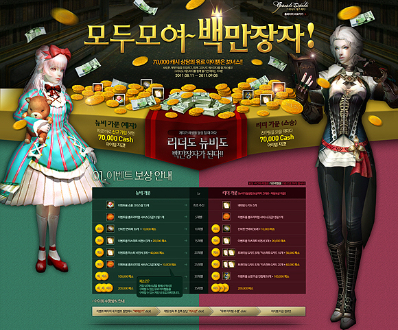 기존 유저 또한 친구를 모으거나 각종 대형 포털, 웹진 등에 게임을 소개하고, 새로 유입된 신규 유저를 자신의 뉴비(제자)로 유치하면 1인당 총 70,000 캐시에 상당하는 혜택을 받게 되며, 뉴비 모집 인원수 제한 없이 자신을 등록한 모든 뉴비들이 성장하면 무한으로 보상을 받을 수 있다.