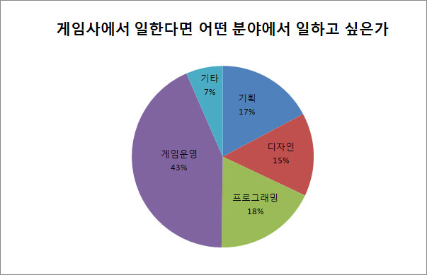 또한 ‘게임회사에 입사한다면 어떤 분야에서 일하고 싶은가’ 란 질문에는 ‘게임운영을 해보고 싶다’고 답한 사람이 43%로 가장 높게 나왔으며 ‘게임기획’은 17%, ‘프로그래밍’ 15%, ‘디자인’ 18% 로 비슷한 비율을 보였다.