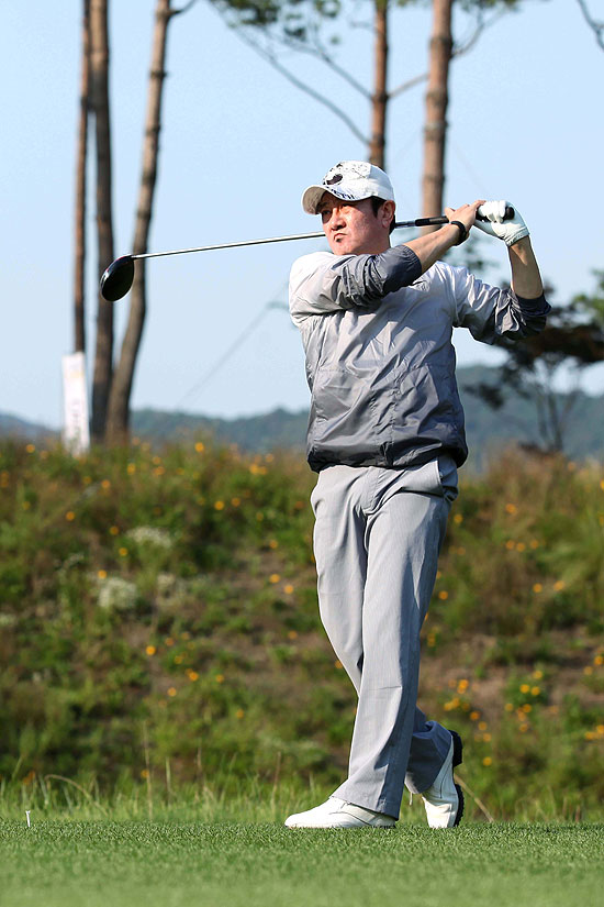 ▲ 샷온라인 골프축제 10회 시타를 하고 있는 연예인 박준규 씨