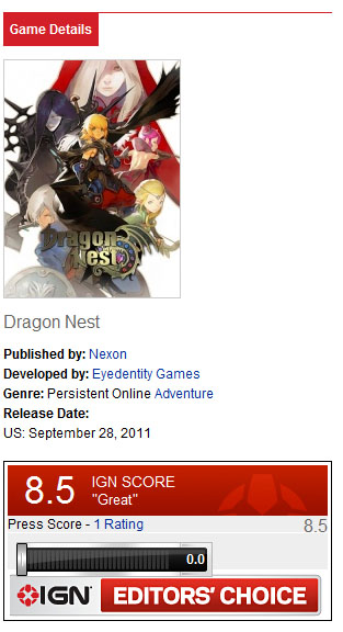 아이덴티티게임즈가 개발하고 넥슨 아메리카가 서비스하는 액션 MORPG `드래곤네스트` 가 북미 유력 게임웹진인 IGN으로부터 평점 8.5점의 높은 점수와 더불어 극찬을 받으며 북미 시장에서의 활발한 행보를 기대하게 했다. IGN 은 게임스팟과 더불어 북미 지역의 가장 대표적인 게임 미디어....