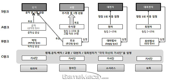 예컨대 워리어의 경우 공성을 통해 A등급인 공작까지 오를 수 있지만, 말 그대로 지존이라 부를만한 황제가 되기 위해서는 같은 직업은 물론 팔라딘의 투표에 영향을 받는다. 흥미로운 건 황제 투표에 영향력을 행사하는 팔라딘의 등급은 가장 상위의 교황이 아닌 B등급의 주교(놀랍게도 주교는 교황이 임명하는 방식)다. 때문에 워리어를 플레이하는 유저가 황제가 되기 위해서는 상대 직업 플레이어와의 교류가 반드시 필요하다. 결과적으로 공성, 선거, 랭킹, 상위 유저 임명이 복합적으로 연계돼 있어 유저간의 견제 및 협력이 가능한 형태의 정치 시스템을 도입한 셈이다.
