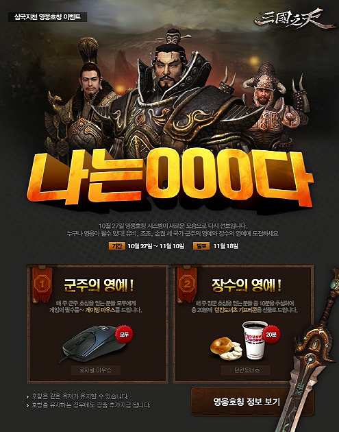 재구성된 호칭시스템은 명성포인트를 매주 국가별로 제일 많이 획득한 유저가 해당 국가의 군주인 유비, 조조, 손권의 호칭을 얻게 되며, 이외 장군 호칭 또한 국가마다 직업당 1위~3위까지 명성 포인트에 따라 자동으로 부여된다. 내달 10일까지 기간 내 군주 호칭을 달성한 유저 6명에게는 고급 마우스를, 장군 호칭을 획득한 유저 20명에게도 추첨을 통해 기프티콘을 제공한다.