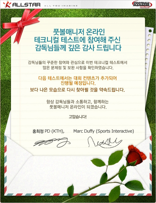 KTH 게임사업본부 홍희정 PD는 “오랜 시간 `풋볼매니저 온라인` 을 기다려주시고 이번 테스트에도 적극적으로 참여해 피드백을 보내준 유저들에게 진심으로 감사 드린다. 의견 하나하나 세밀히 검토하여 게임에 반영하도록 노력하겠다. 이번에 선보이지 못한 PvP 및 컵 대회 콘텐츠를 중심으로 한 추가 테스트도 준비 중이니 꾸준한 기대와 관심 부탁 드린다” 고 말했다.