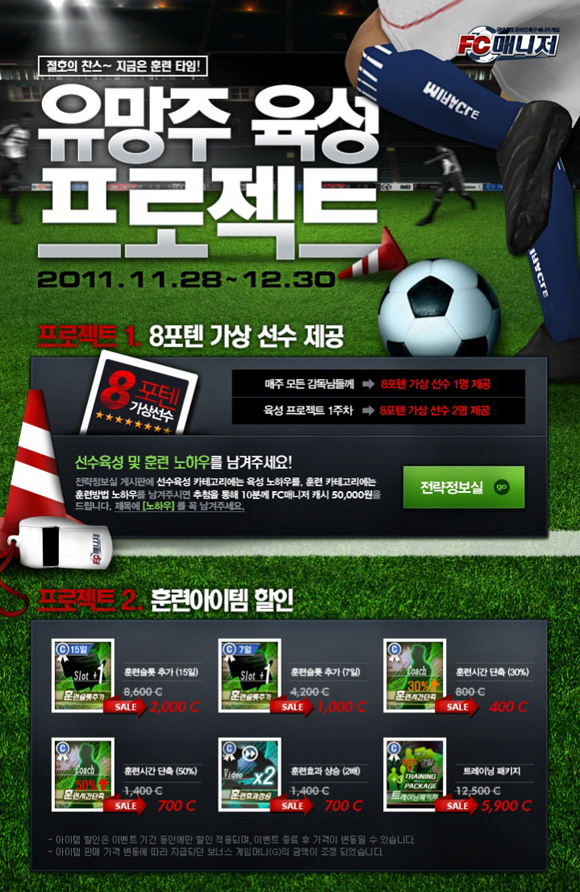 내달 30일까지 5주간에 걸쳐 진행되는 ‘유망주 육성 프로젝트’ 는 매주 월요일 정기점검과 함께 8포텐의 유소년 선수를 1명씩 제공하고, 선수 육성을 도와주는 다양한 훈련 관련 아이템 6종을 대폭 할인된 가격으로 판매한다.