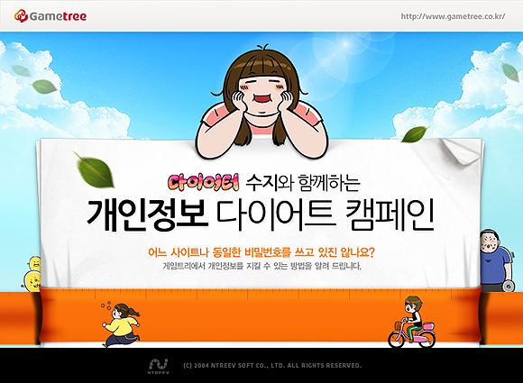 인기 웹툰 `다이어터`와 함께 하는 `개인정보 다이어트`는 `온라인에 노출된 개인정보를 줄이자`는 내용의 캠페인으로 만화를 통해 개인정보 보호 방법과 필요성에 대해 소개한다. 유저는 재미있는 웹툰을 통해 비밀번호 변경의 중요성과 아이핀 소개, 개인정보 노출시 대처법에 대한 정보를 얻을 수 있다.