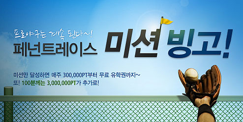 이외에도 `프로야구 매니저`는 페넌트레이스에서 ‘5연승 이상’, ‘포스트 시즌 진출’, ‘팀 홈런 80개 이상’ 등 다양한 미션을 달성하면 일주일 동안 최대 30만 PT(게임머니)를 지급한다. 또한, 이들 미션을 완료해 빙고를 만들면 빙고 달성 횟수에 따라 선수카드, 무료 유학권, 무료 재계약권 등 게임 아이템을 얻을 수 있는 쿠폰을 지급하는 빙고 이벤트를 오는 31일까지 진행한다.