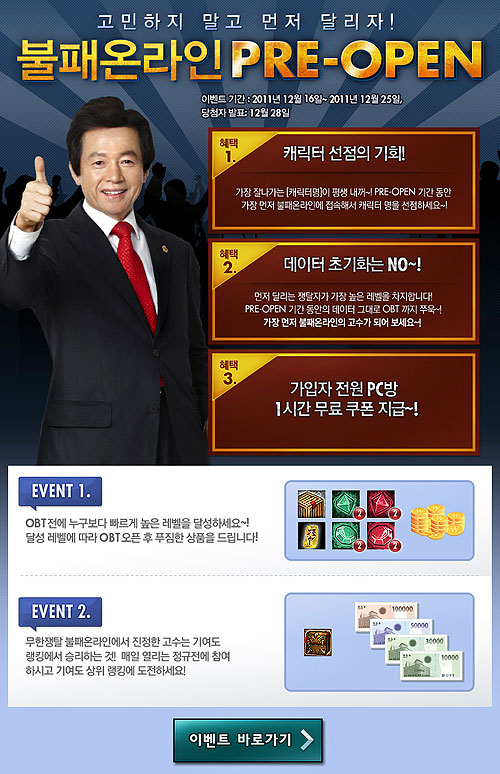 본격적인 서비스에 앞서 최종 점검을 진행하게 될 ‘불패온라인’의 이번 사전공개서비스는 오는 12월 25일 자정까지 종료 없이 계속되며, 참여자의 캐릭터 이름과 레벨 등의 정보는 초기화 없이 공개서비스로 이어진다.